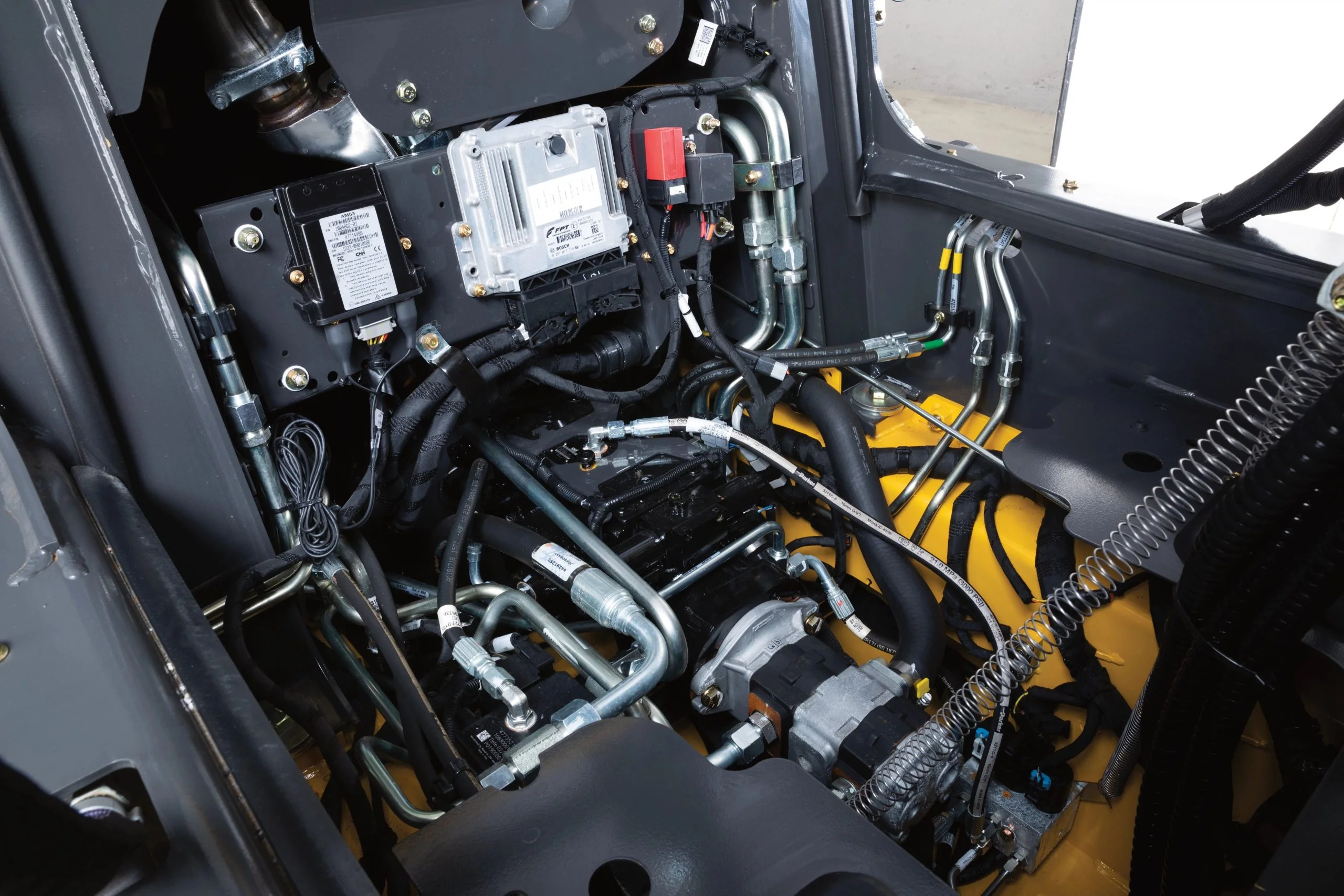 Pour encore plus de productivité, le mode rampant (modèles EH uniquement) disponible vous permet de trancher, de raboter à froid ou de couper des broussailles avec une précision accrue à des vitesses inférieures. Dans le cadre d’applications de chargement et de transport intensives, le correcteur d’assiette Glide Ride en option stabilise les charges pendant le transport. Un écran LCD multifonction de 8 po personnalisable avec une caméra de recul intégrée vous donne un aperçu rapide et pratique des paramètres du moteur et des données sur la performance, tout en offrant une visibilité encore plus grande à l’arrière de la chargeuse pour une utilisation plus efficace et plus sûre. La cabine de la série 300 est l’une des plus spacieuses du secteur. Elle est silencieuse, facile d’accès et vous permet de voir clairement dans toutes les directions, même vers le godet ou les accessoires relevés. Vous bénéficiez d’une visibilité sans précédent à l’arrière grâce à l’écran LCD multifonction de 8 po, à la grande vitre arrière, au positionnement bas du capot et à l’absence de tours de châssis arrière. La cabine entièrement étanche et pressurisée minimise l’infiltration de poussière et de gaz d’échappement. Le système hydraulique fiable permet de bénéficier de cycles plus courts. Les pompes hydrauliques en ligne réduisent le bruit et procurent un fonctionnement en douceur. Ajoutez les circuits hydrauliques haut débit en option pour faire fonctionner des accessoires heure après heure. Les moteurs Tier 4 Final de New Holland offrent également une performance puissante, ils consomment moins de carburant et sont faciles à entretenir, ce qui réduit vos frais d’exploitation. Le train de roulement sur chenilles à profil bas facilite le nettoyage, réduit le bruit et augmente la durabilité. Il offre également une conduite plus douce grâce aux chenilles enrobées en acier roulant sur le caoutchouc au lieu de l’acier. Le nombre inférieur de pièces mobiles par rapport aux concurrents réduit la complexité et les complications, ce qui augmente la durée de vie des chenilles. Tous les points d’entretien quotidien sont regroupés et la porte arrière et le capot permettent d’y accéder facilement sans outils. Si nécessaire, la cabine peut être basculée vers l’avant pour un accès inégalé aux différents composants de la machine et un nettoyage aisé de la cabine.